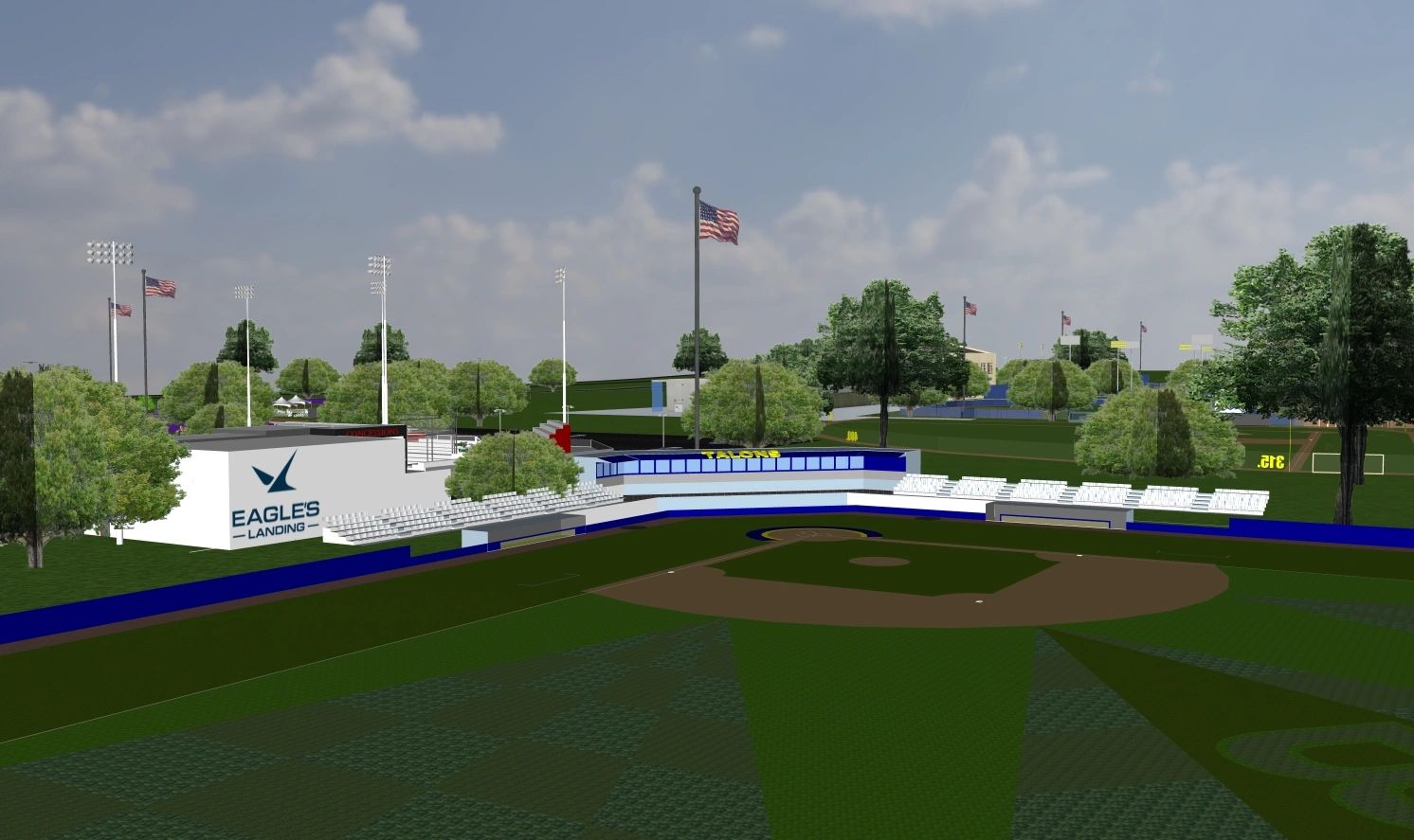 Eagle’s Landing will feature 21 turf baseball fields—including 12 high school fields, 8 middle school fields, and 1 Miracle Field designed for athletes with special needs.